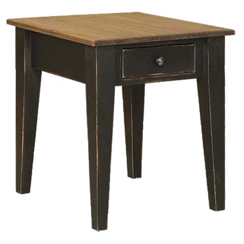 You invested in your living room furniture, so don’t skimp out on the end tables. If you go with a low-quality, screw-together piece made from pressed board, you’ll be replacing it in a few years. Instead, invest in heirloom quality furniture from Carriage House Furnishings. Nestled in the heart of Amish country in Lancaster, PA, each of our pieces is hand-crafted by the Amish from natural pure wood and is built to last. This end table with drawer is no exception– you’ll require guests to use coasters! It measures 22d x 20w x 23h and is made from Pine with a Maple top. Shown here in Black and Special Walnut Finish.